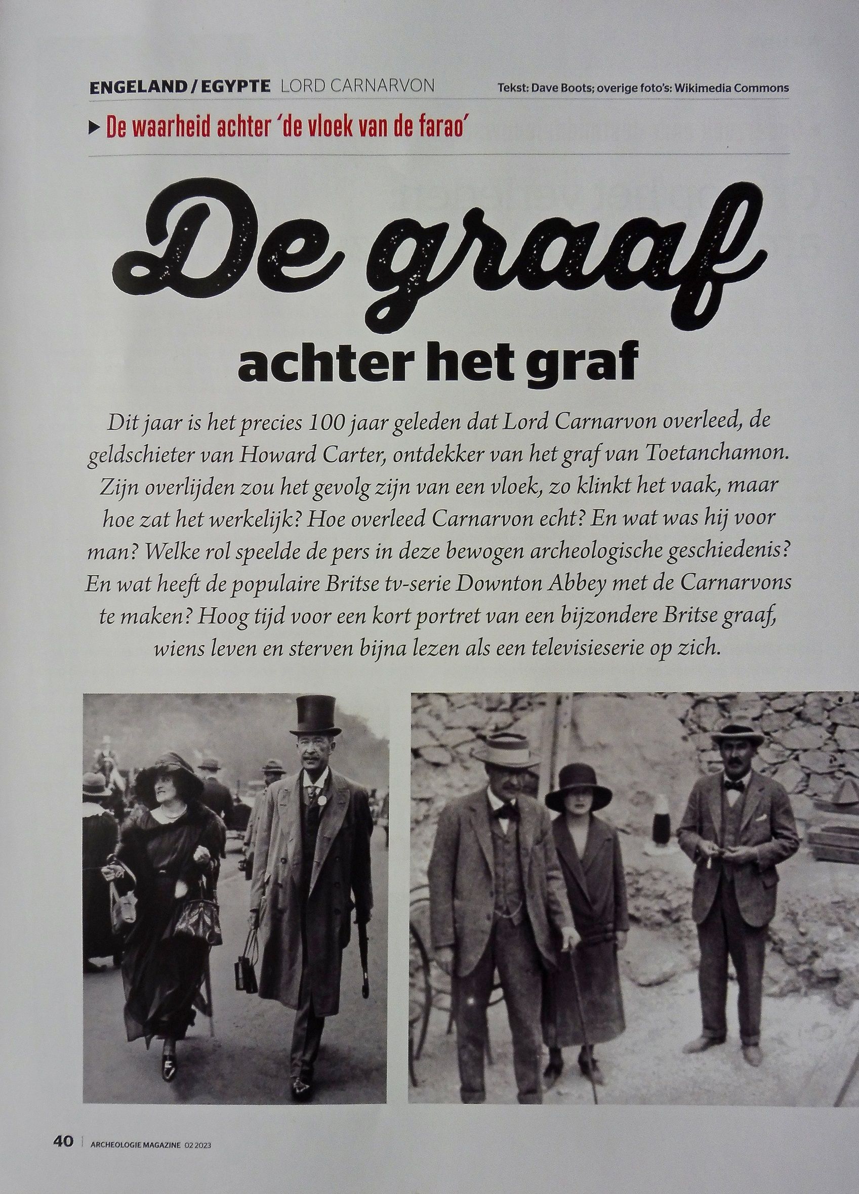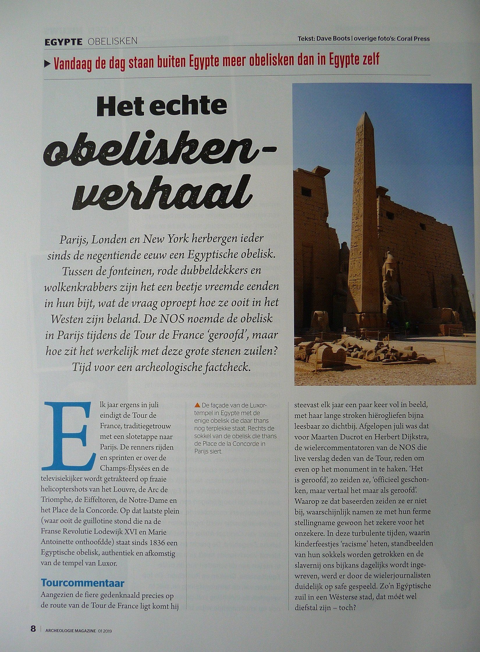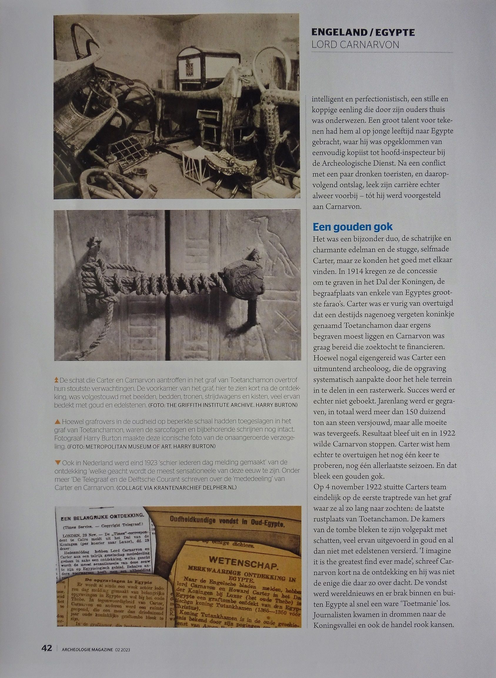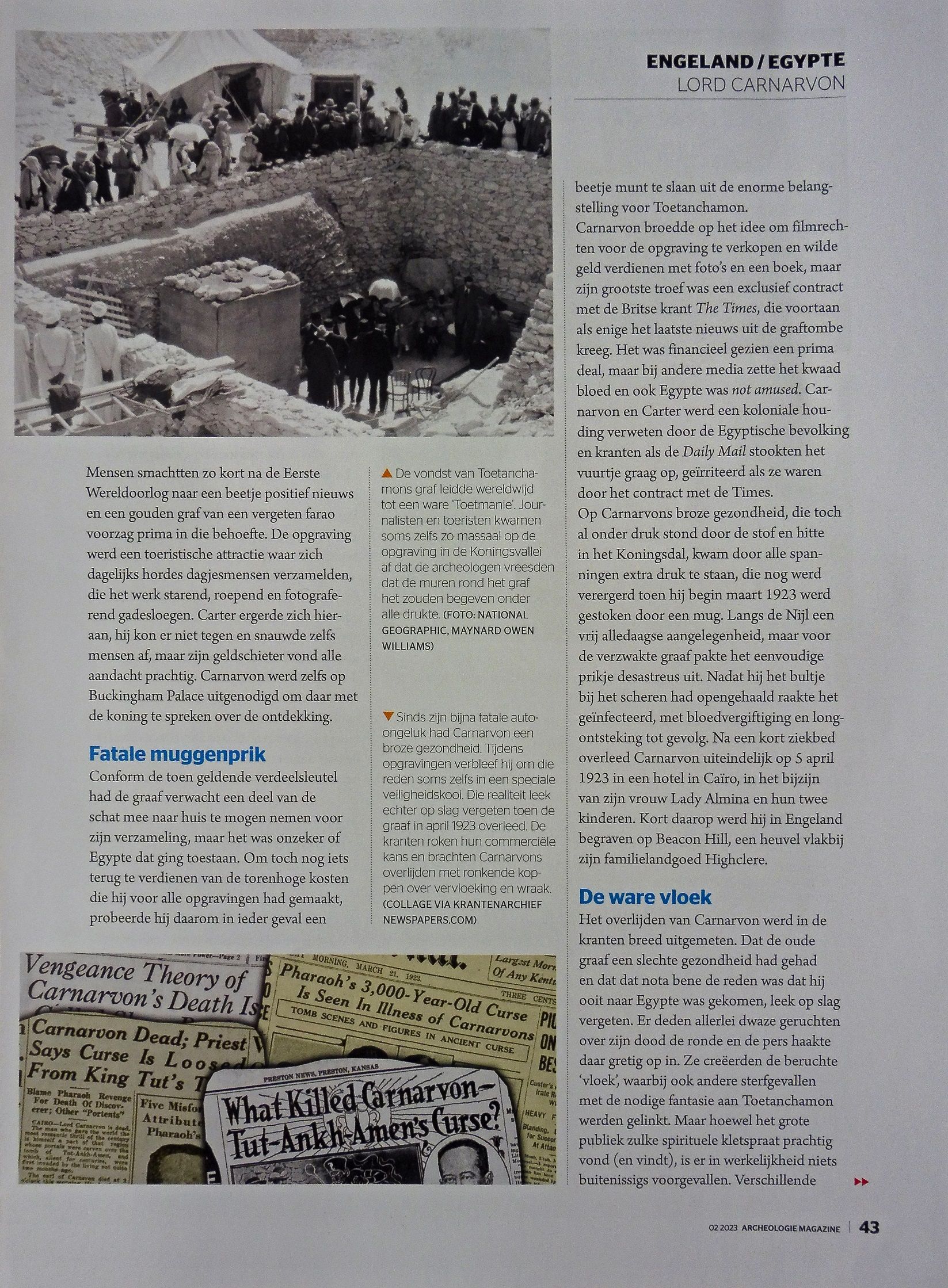 De afgelopen jaren heb ik verschillende keren met artikelen in populair-wetenschappelijke geschiedenisbladen gestaan. Dit gaat om stukken in KIJK-Geschiedenis en National Geographic Historia, maar de meeste artikelen heb ik geschreven voor Archeologie Magazine. Hoewel ook mijn woonplaats Enkhuizen soms ter sprake komt in de teksten, gaan de meeste over het oude Egypte. Zo heb ik bijvoorbeeld iets geschreven over de Egyptische verzameling van het Haagse Museum Meermanno, over de Egyptische obelisken in Parijs, Londen en New York en over de Britse graaf Lord Carnarvon en de 'vloek van Toetanchamon'. De artikelen bevatten een hoop informatie, maar als het goed is staat het allemaal zó opgeschreven dat het toch prettig "wegleest". Enfin, of dat zo is kunt u zelf hieronder oordelen. Door op de foto's van de pagina's te klikken, opent vanzelf een grotere, leesbare versie. Veel leesplezier!