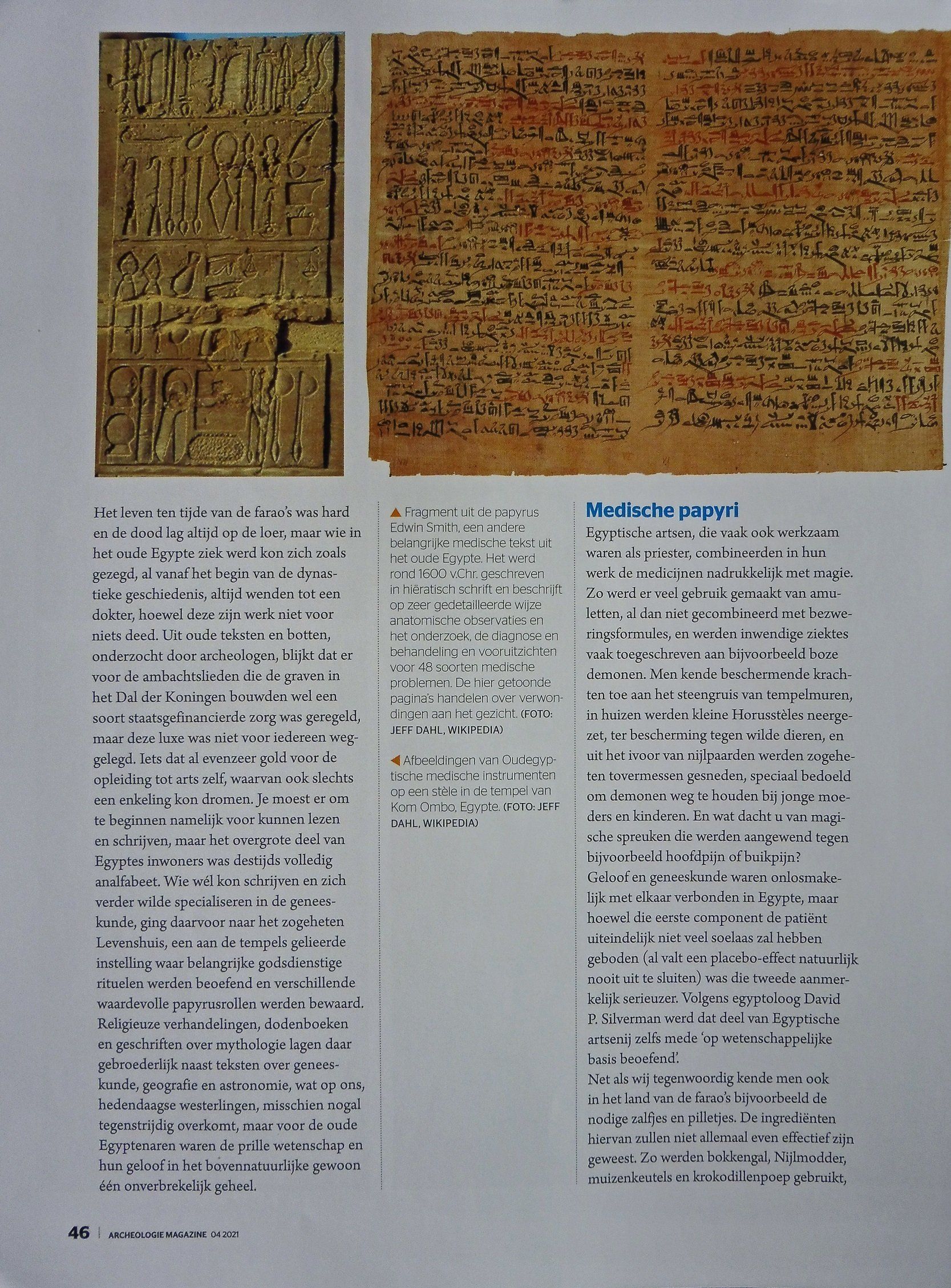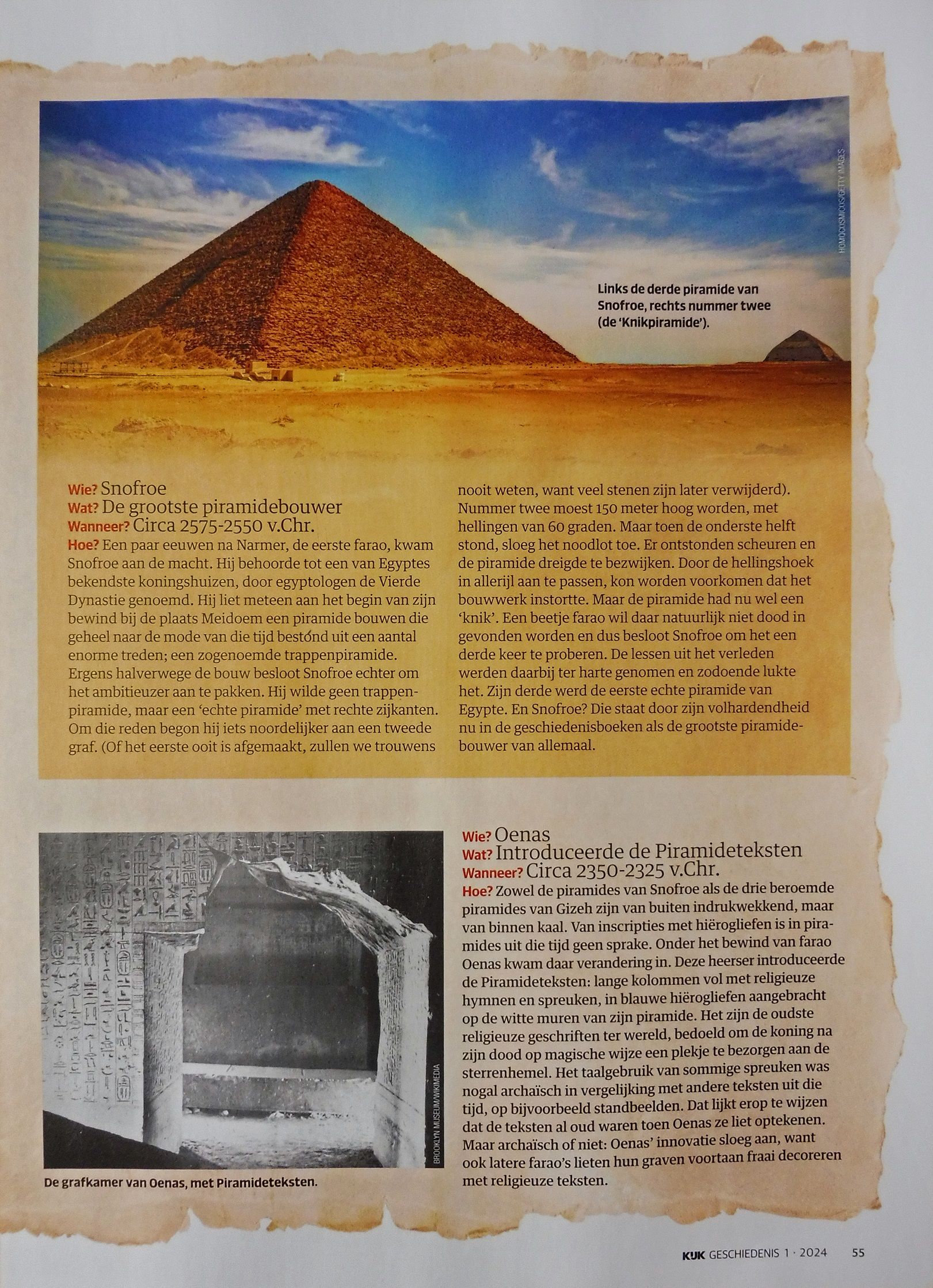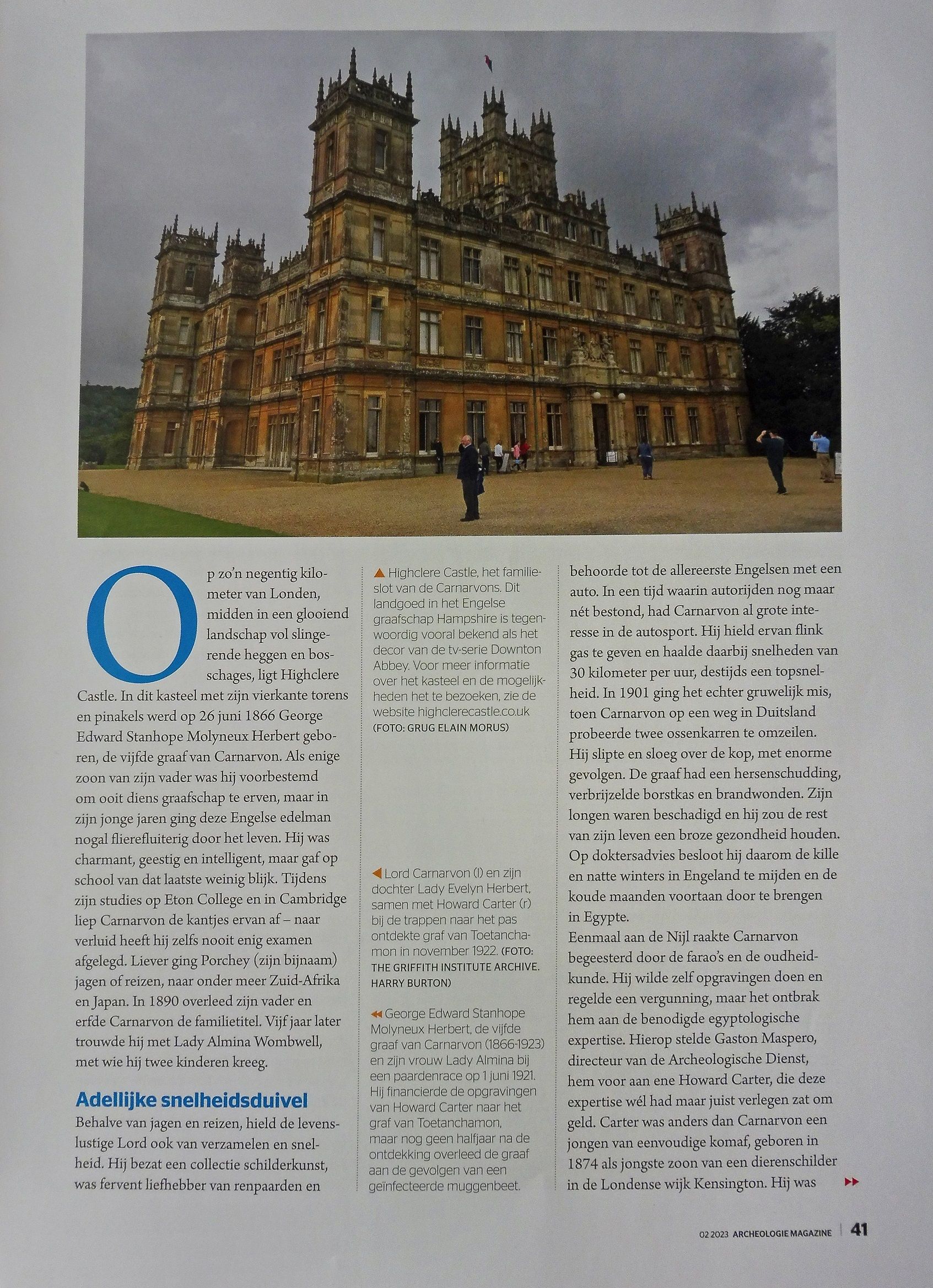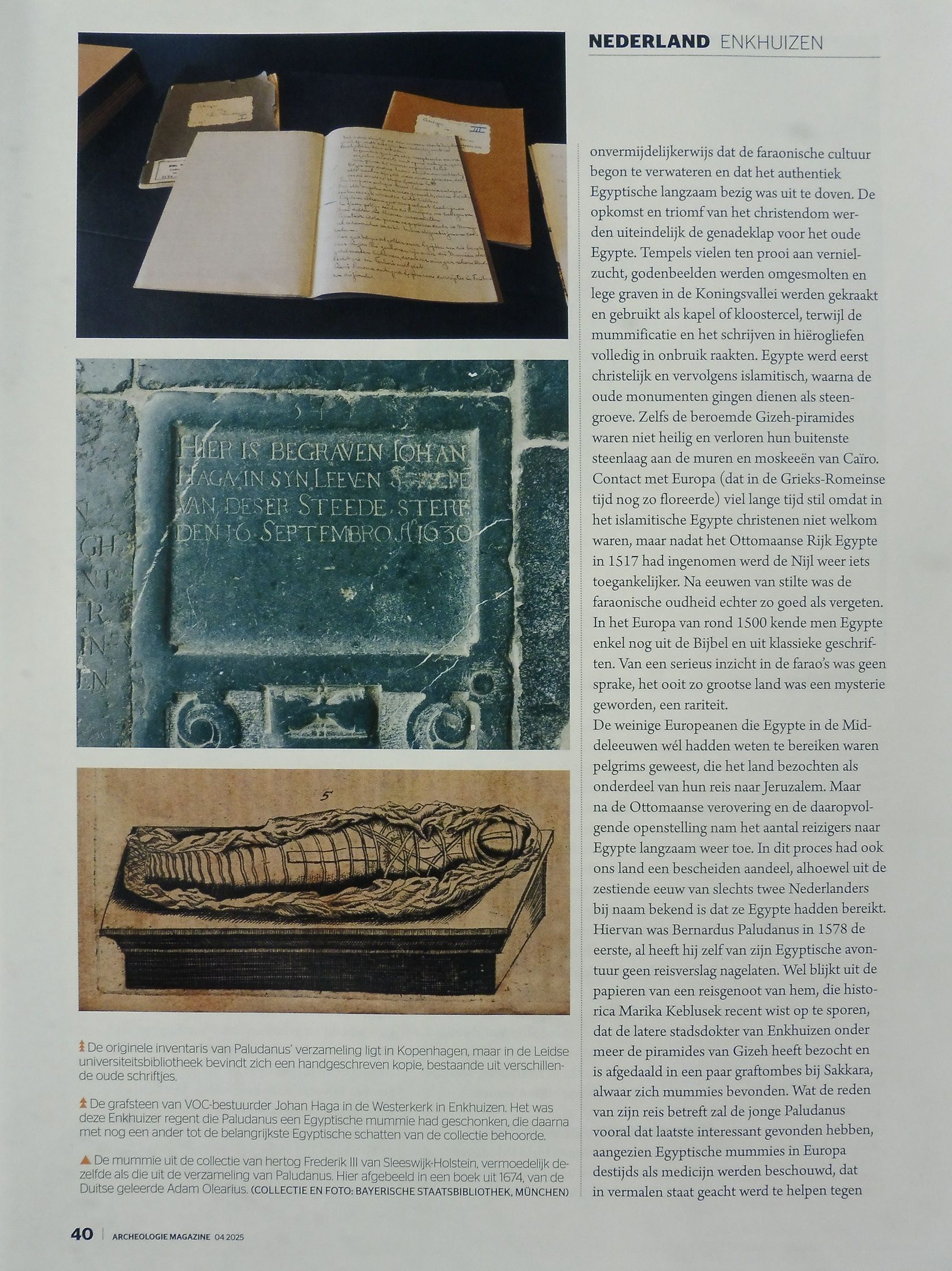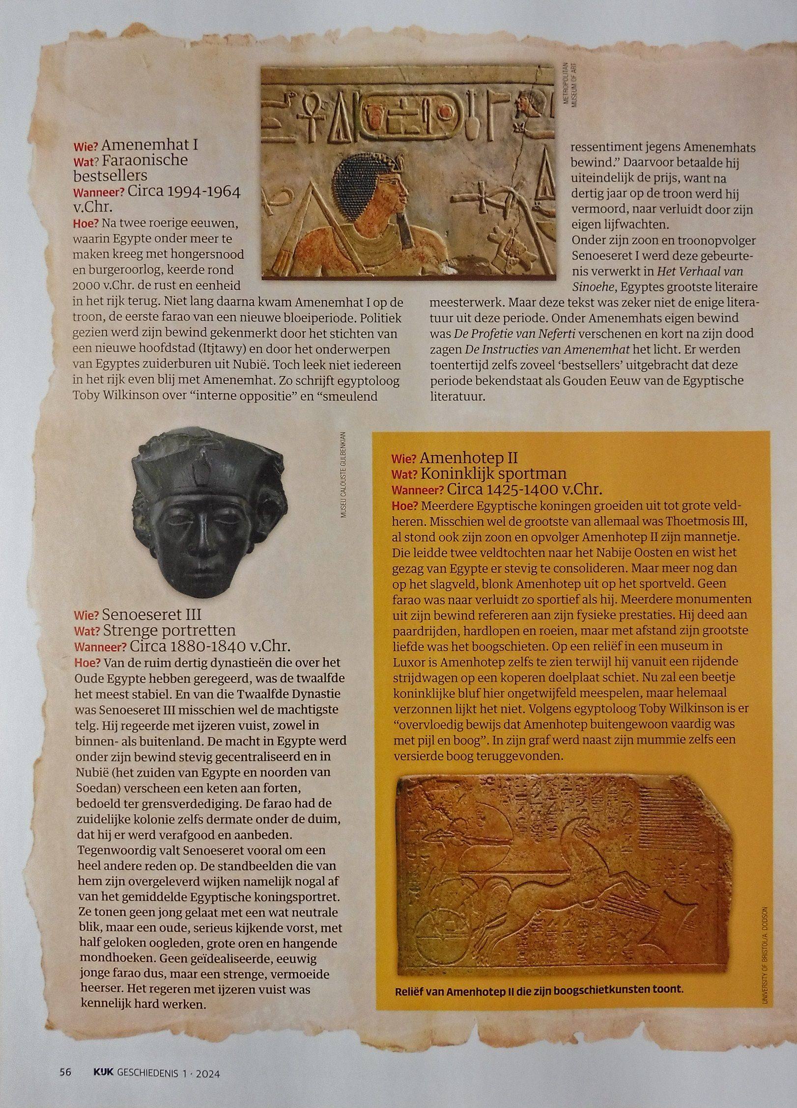 De afgelopen jaren heb ik verschillende keren met artikelen in populair-wetenschappelijke geschiedenisbladen gestaan. Dit gaat om stukken in KIJK-Geschiedenis en National Geographic Historia, maar de meeste artikelen heb ik geschreven voor Archeologie Magazine. Hoewel ook mijn woonplaats Enkhuizen soms ter sprake komt in de teksten, gaan de meeste over het oude Egypte. Zo heb ik bijvoorbeeld iets geschreven over de Egyptische verzameling van het Haagse Museum Meermanno, over de Egyptische obelisken in Parijs, Londen en New York en over de Britse graaf Lord Carnarvon en de 'vloek van Toetanchamon'. De artikelen bevatten een hoop informatie, maar als het goed is staat het allemaal zó opgeschreven dat het toch prettig "wegleest". Enfin, of dat zo is kunt u zelf hieronder oordelen. Door op de foto's van de pagina's te klikken, opent vanzelf een grotere, leesbare versie. Veel leesplezier!