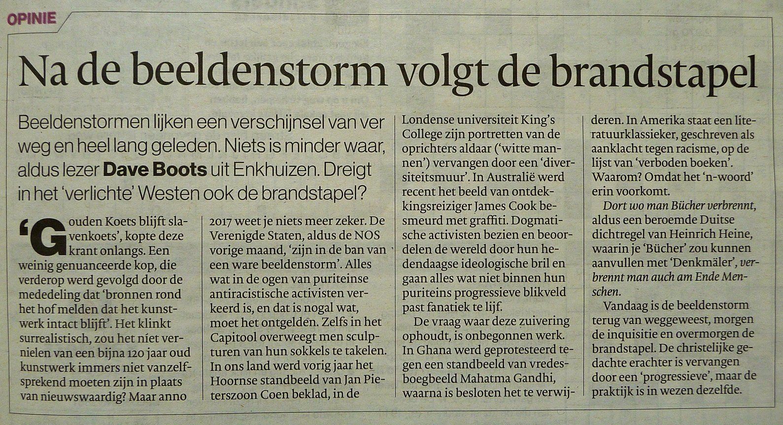 Waar een ingezonden brief doorgaans niet verder komt dan 100 á 200 woorden, en in de regel een reactie is op een stuk uit de krant, is een opiniestuk langer én staat het meer "op zichzelf". De afgelopen jaren hebben verschillende van zulke stukken van mij het tot publicatie weten te schoppen, onder andere een aantal keer in het AD. Wat voor m'n ingezonden brieven geldt, geldt echter al evenzeer voor mijn opiniestukken: het is work in progress, schrijverij in ontwikkeling. De eerste laten achteraf gezien te wensen over, maar als het goed is wordt de boel al doende steeds ietsjes beter - een beetje vergelijkbaar met een bakker die al doende steeds betere taartjes bakt. Hoe dan ook, hieronder staan al mijn opiniestukken, de goede én de mindere, netjes op een rij, zodat u zelf kunt oordelen. Veel leesplezier!