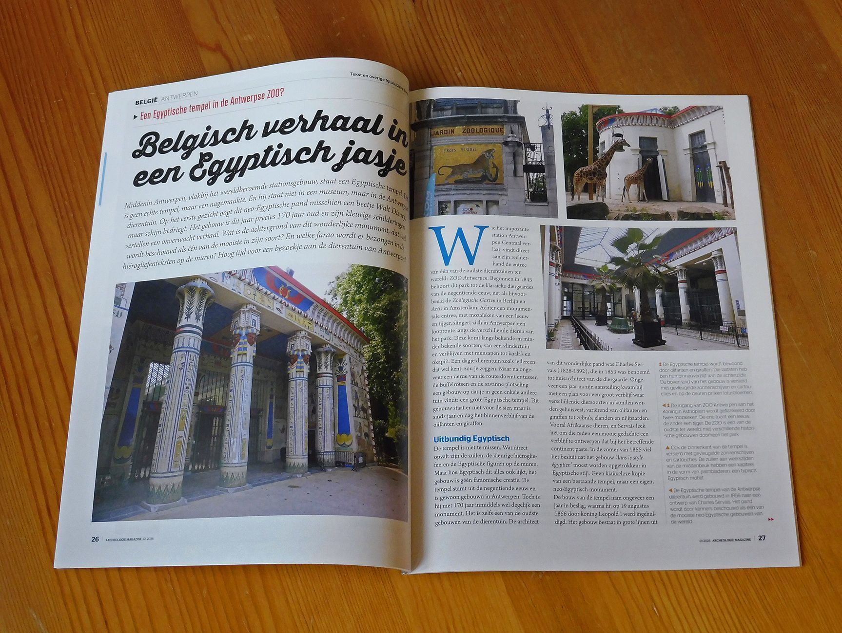 Afgelopen vrijdag verscheen het nieuwe nummer van Archeologie Magazine, mét daarin een artikel van mij over de neo-Egyptische tempel in de dierentuin van Antwerpen. Getiteld Belgisch verhaal in een Egyptisch jasje komen de geschiedenis achter dit wonderlijke olifantenverblijf, de vraag waarom die opvallende Egyptische stijl én de betekenis van de figuren en hiërogliefen op de tempel aan bod. Bij het artikel staan acht foto's van het gebouw, die ik vorig jaar heb gemaakt toen ik tijdens een vakantie naar België de Antwerpse dierentuin bezocht. Vrijwel meteen toen ik de tempel destijds zag, borrelde het idee bij me op om er iets over te schrijven. Zo'n wonderlijk pand, daar moest toch een verhaal inzitten? En zo ja, misschien wel een artikel! Nadat het stuk was geschreven, en de foto's uitgezocht, heb ik het afgelopen december naar de redactie gestuurd, die het graag wilde plaatsen en het direct op de rol zette voor het eerste nummer (februari) van dit jaar. Overigens is één van de foto's niet gemaakt in Antwerpen, maar in de Koninklijke Bibliotheek in Den Haag. Daar namelijk ligt het enorme boek waaruit de schilder van de Antwerpse tempel inspiratie putte voor zijn kleurige schilderingen. Hoe dat precies zit? En wat hij precies schilderde? Dat kunt u allemaal lezen in het nieuwe nummer van Archeologie Magazine! Het blad is te koop in de wat grotere boekhandels en online via deze link.