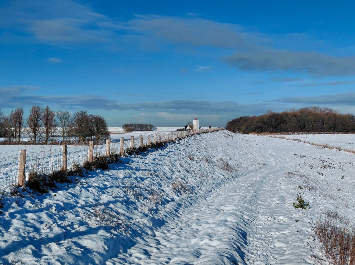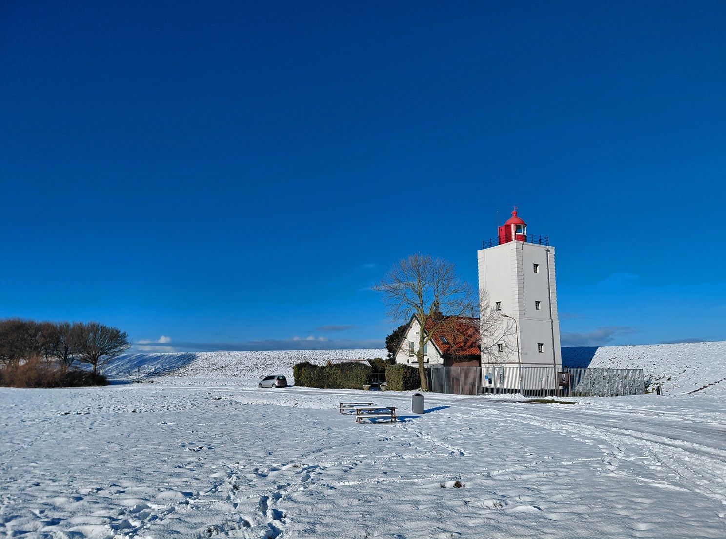 Voor de hagelwitte vuurtoren de Ven is al die witte sneeuw bijna een schutkleur
